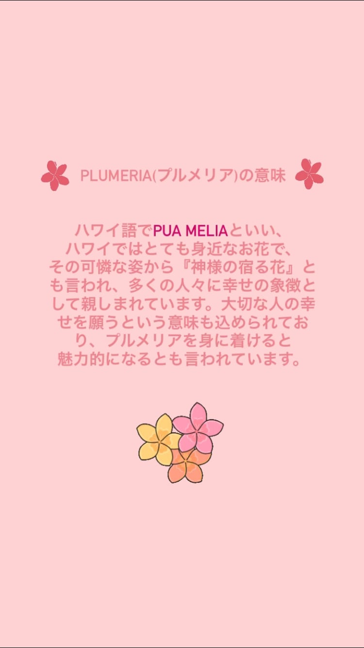 ハワイ語でPua Meliaといい、ハワイではとても身近なお花で、その可憐な姿から『神様の宿る花』とも言われ、多くの人々に幸せの象徴として親しまれています。大切な人の幸せを願うという意味も込められており、プルメリアを身に着けると魅力的になるとも言われています。