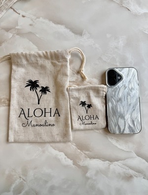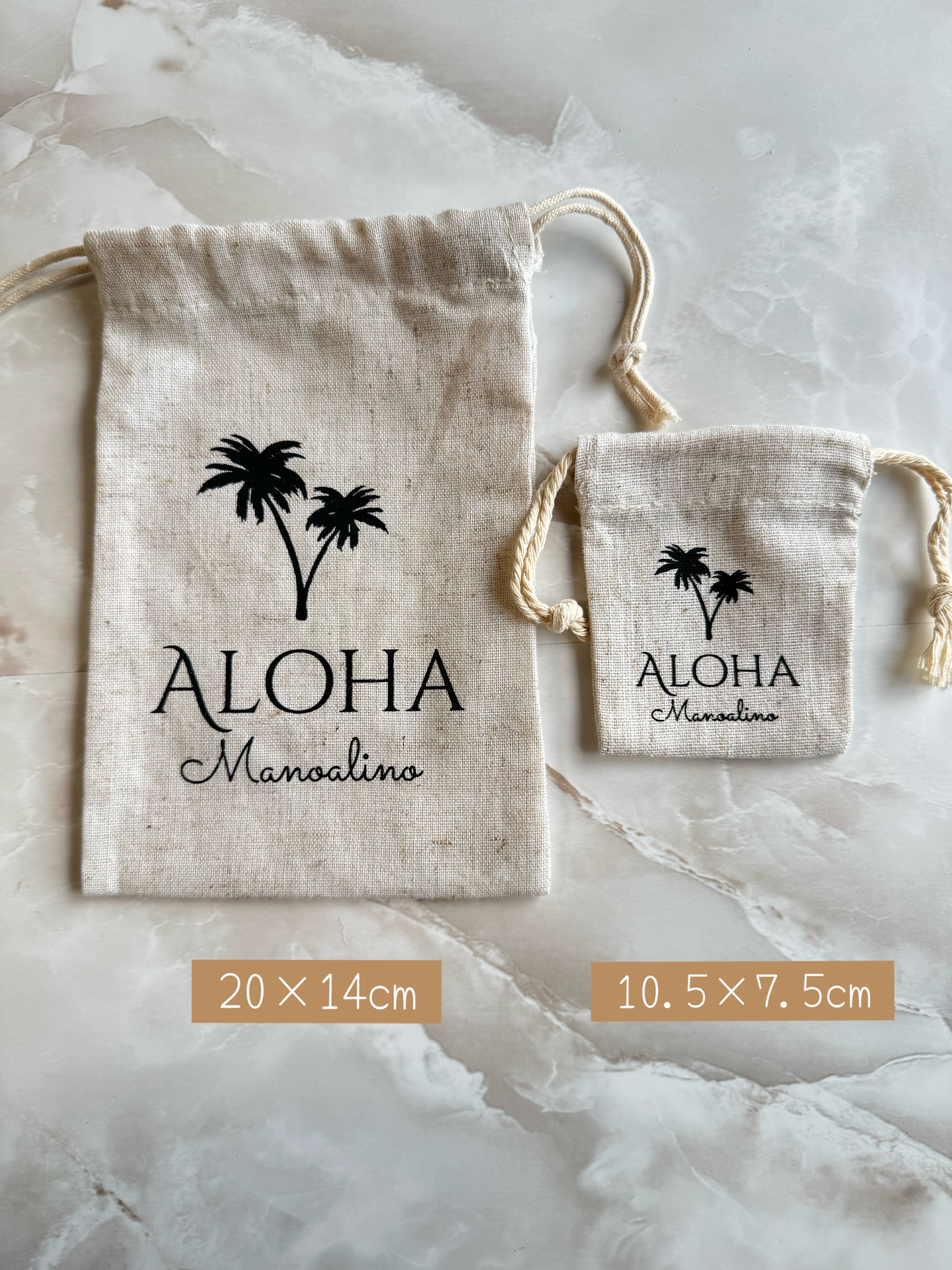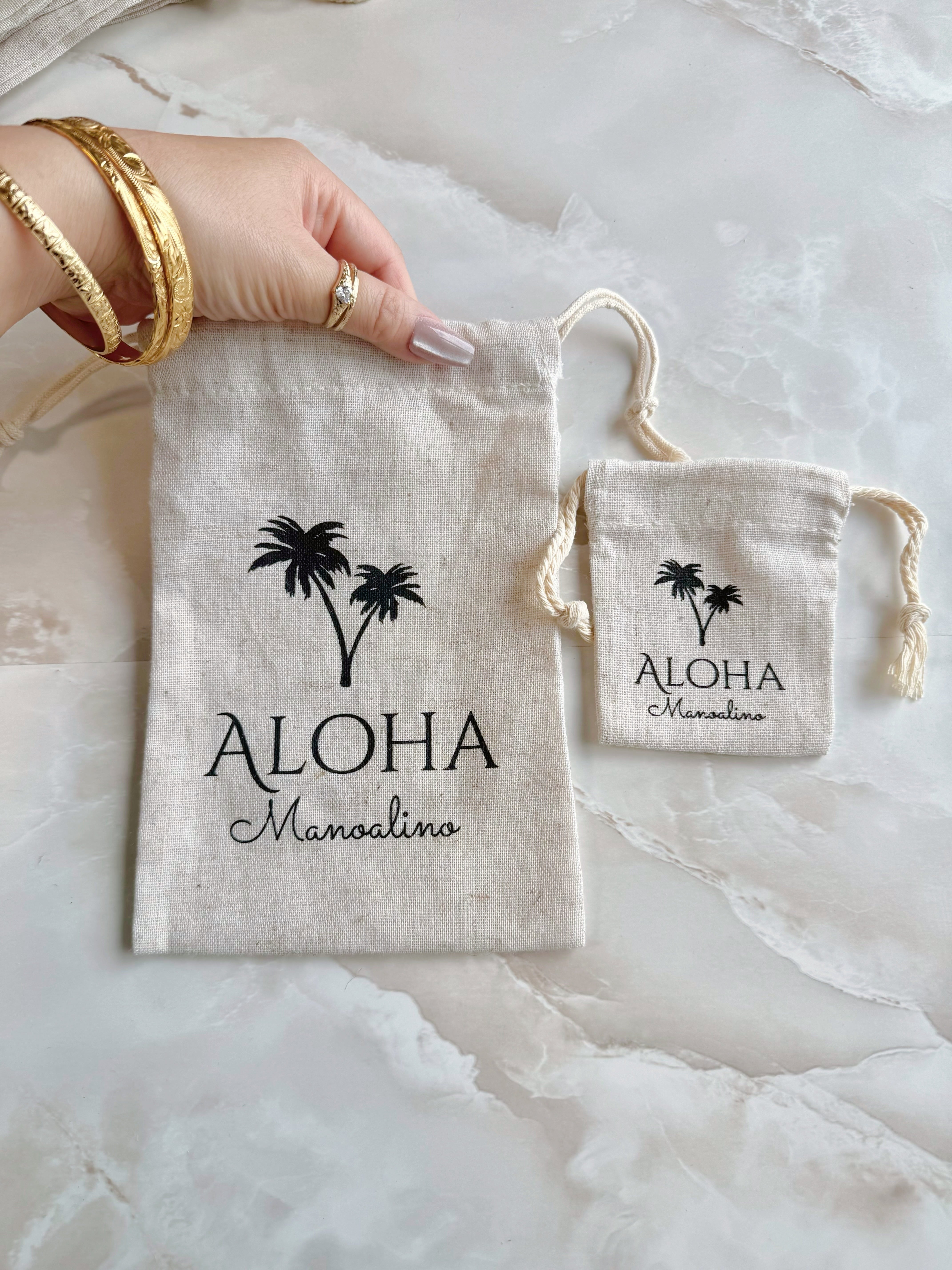 "人気のManoalinoオリジナルAloha巾着" サイズ 小 10.5cm×7.5cm 大 20cm×14cm ※ピアス、ネックレスの台紙の代わりにAloha巾着でラッピングご希望の場合は、ご希望商品とこちらを合わせてカートに入れて頂き、決済の際ご希望を備考欄にご記入お願い致します。
